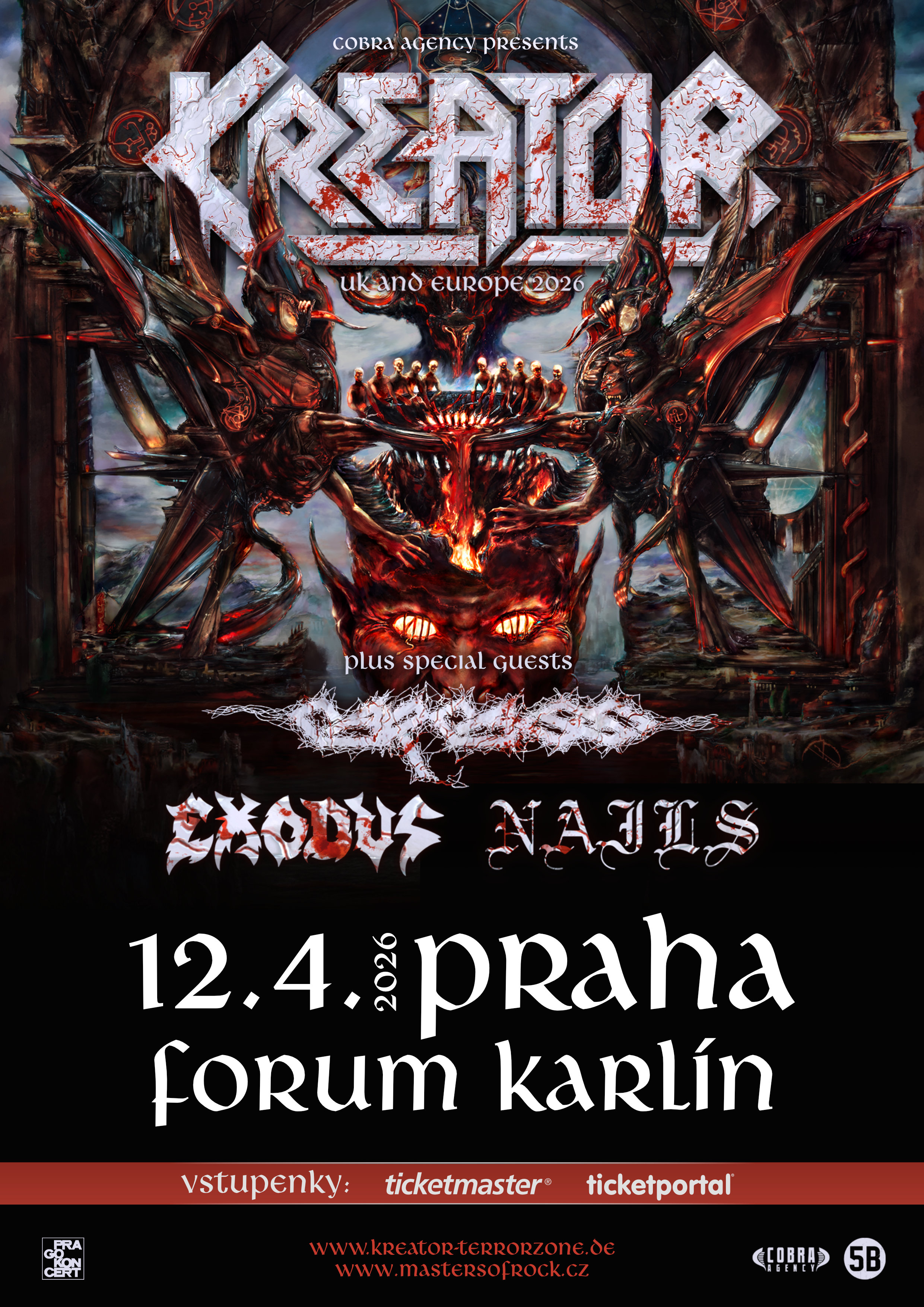 Legendární KREATOR oznámili název svého nového, již šestnáctého studiového alba „KRUSHERS OF THE WORLD“ (vyjde 16. ledna 2026) a připojili rovnou trasu, kudy povedou jejich kroky s tímto novým albem! Do pražského Fóra Karlín dorazí KREATOR se svými mocnými hosty, CARCASS, EXODUS a NAILS, 12. dubna 2026!