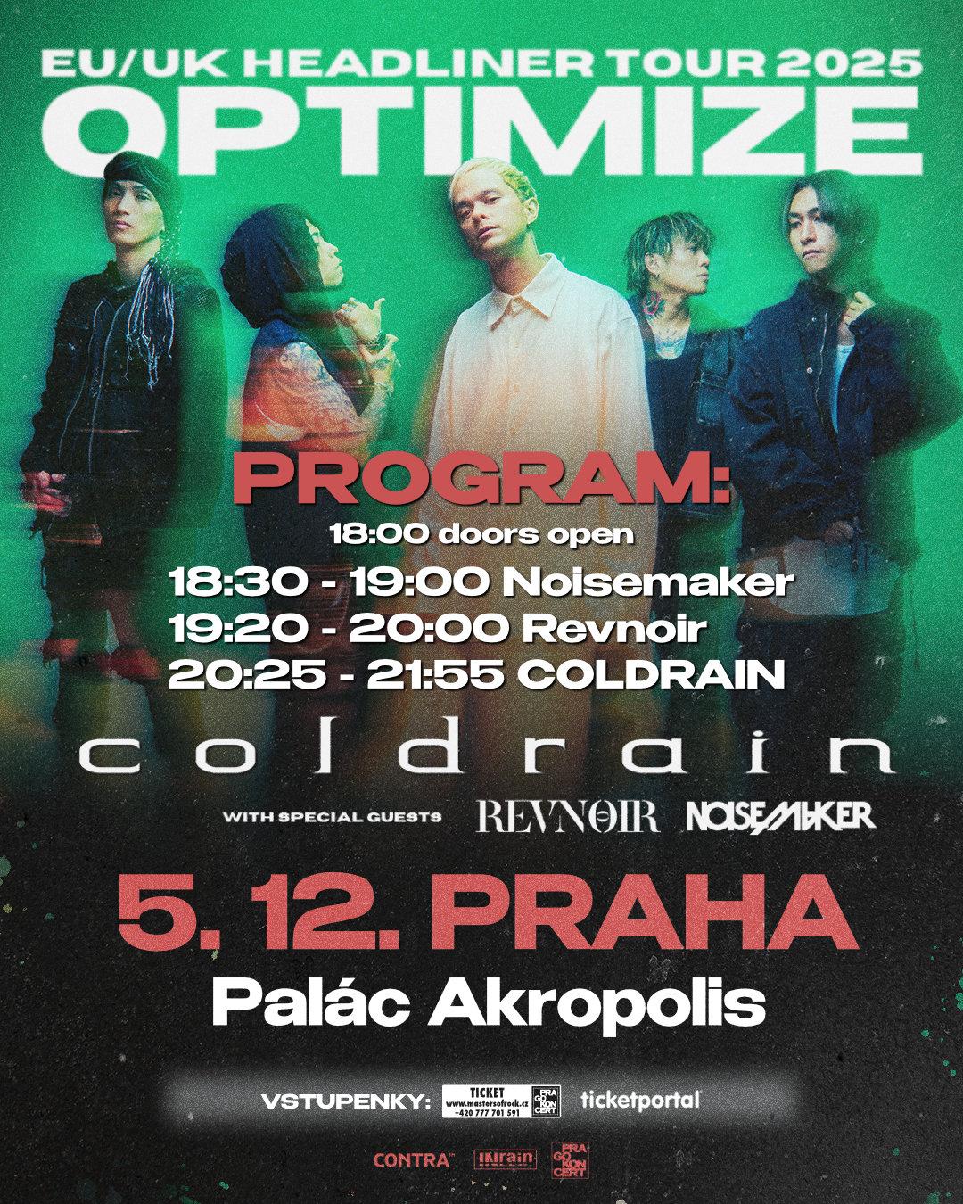 Na druhé straně zeměkoule umí vyrobit optimismus! Japonští metal-core mistři COLDRAIN vám jej přivezou v podobě svého koncertu v rámci turné k nové desce „Optimize“, jako perfektní dáreček k Mikuláši, už tento pátek, 5. 12. 2025 do pražského Paláce Akropolis! Přijďte si pro svoji dávku metal-core energie a radosti, a přijďte včas, tady je program koncertu.