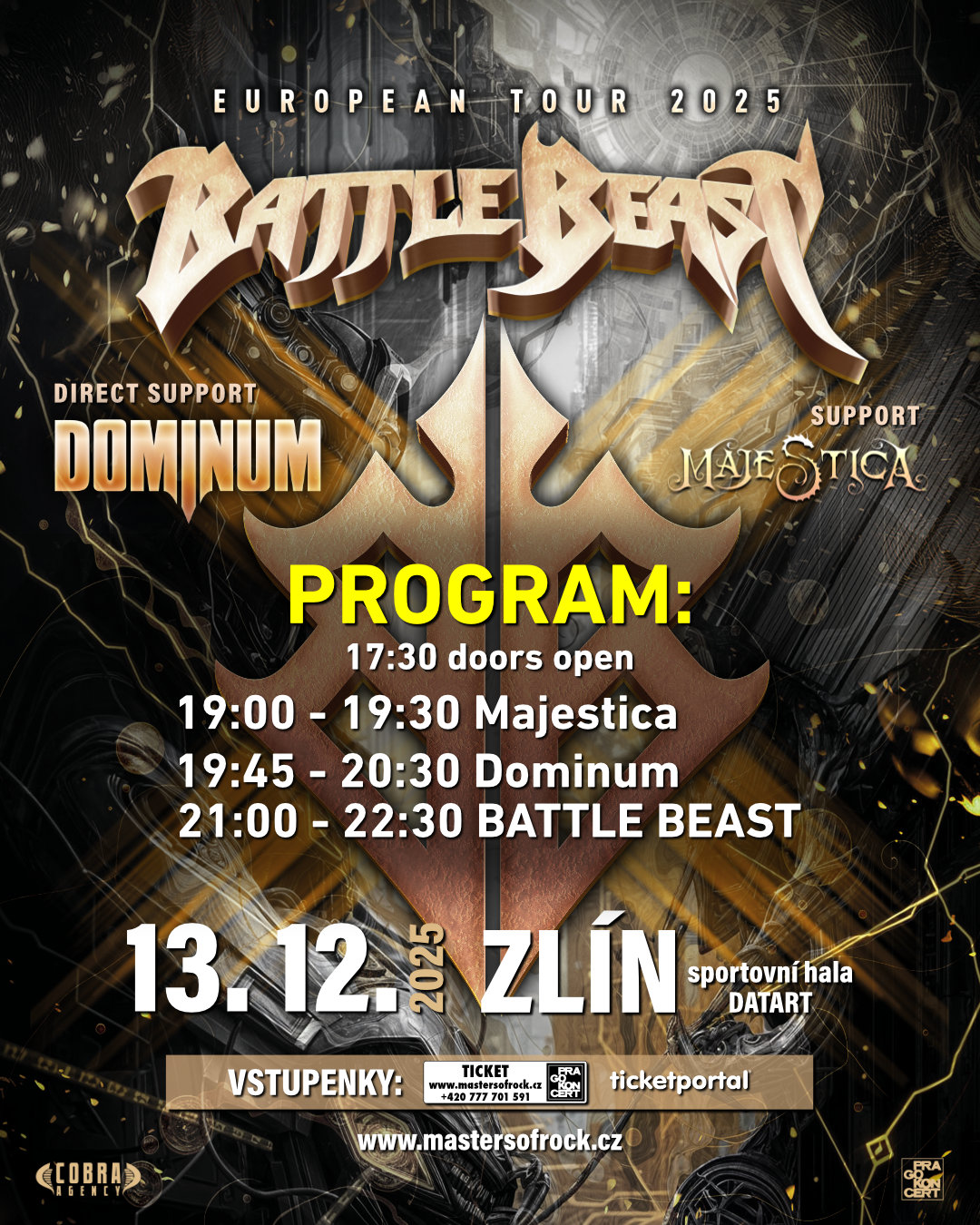 Mocný, silný, jiskrný, svěží a senzačně energický metalový večer vás čeká už tuto sobotu, 13. prosince 2025 ve zlínské sportovní hale Datart! Přijíždí sem finská power-metalová hvězda BATTLE BEAST se zbrusu novou deskou „Steelbound“ a se svou dosud největší pódiovou produkcí, jakou kdy měli! Na turné je doprovází ohromující parta německých metalových zombie DOMINUM a oblíbená symphonic-netalová banda ze Švédska, MAJESTICA! Tento koncert vás bude 100 % hodně bavit, ba co víc, zcela vás pohltí a fantasticky zahřeje! Nenechte si to ujít! Přijďte do haly včas, tady je program koncertu:
