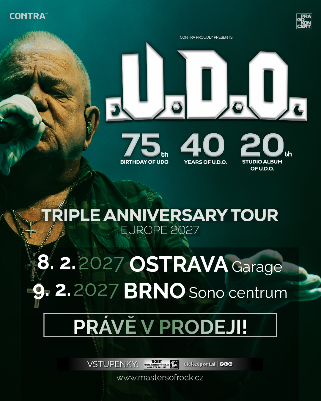 Německá heavymetalová legenda U.D.O. se na začátku roku 2027 vydaá na turné s názvem „Triple Anniversary Tour 2027“, v rámci kterého oslaví tři významné milníky najednou: 75. narozeniny Uda Dirkschneidera, 40 let U.D.O. a nadcházející 20. studiové album kapely, které vyjde začátkem roku 2027. České republice patří hned dva termíny turné, 8. února 2027 dorazí U.D.O. do OSTRAVY, klubu Garage a 9. února 2027 do BRNA, Sono Centra.