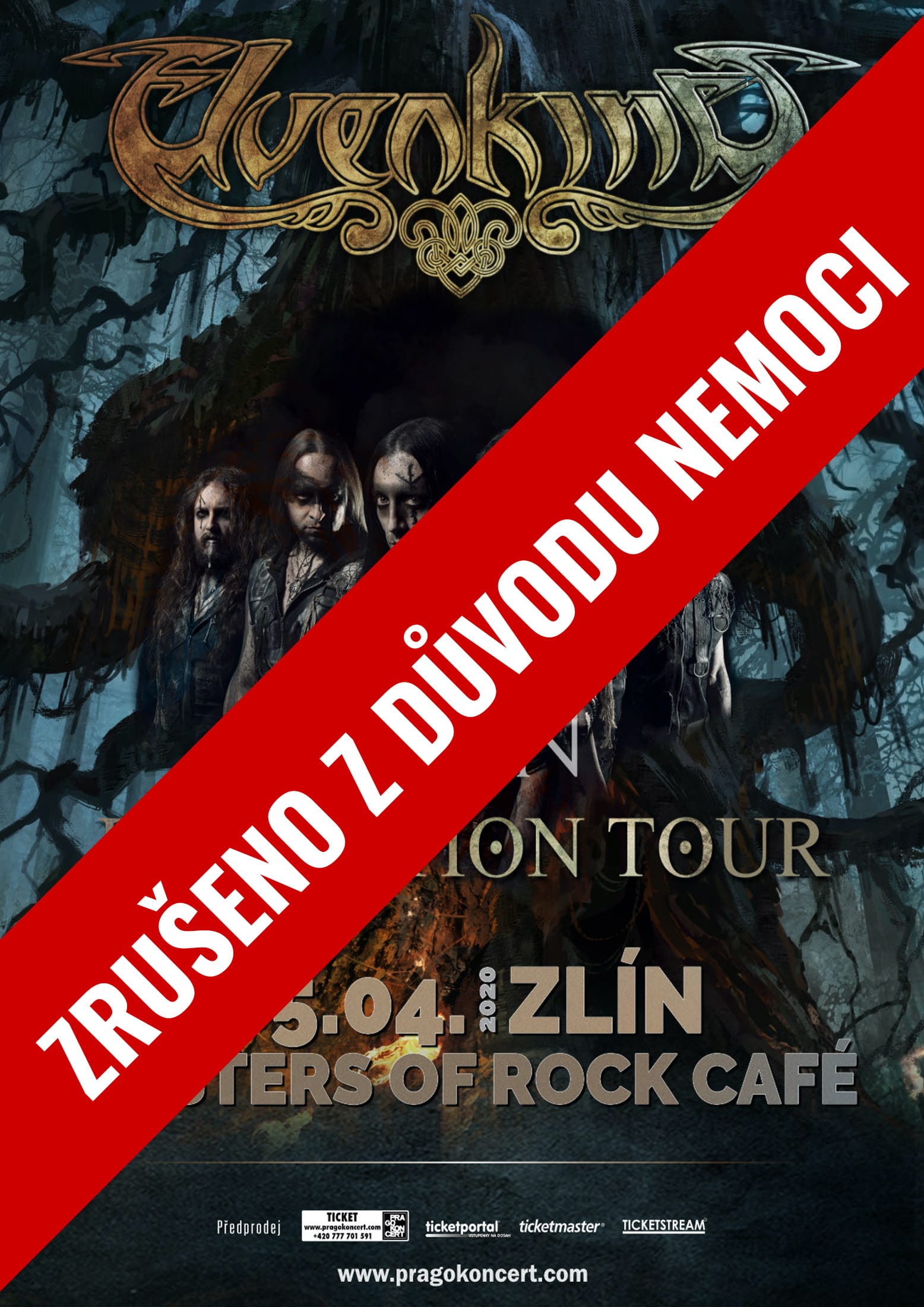 Plánované koncerty folk metalové kapely ELVENKING (4.4. PRAHA a 5.4. ZLÍN) se bohužel odkládají! Pražský koncert má již svůj náhradní termín, bude to 4. 12. 2020! Vstupenky na tento koncert zůstávají v platnosti! Pokud se vám nový termín nehodí, vstupenky můžete vrátit tam, kde jste si je zakoupili, a to do konce dubna! Náhradní termín pro ZLÍNSKÝ koncert se bohužel nepodařilo najít, a tak se RUŠÍ! Zakoupené vstupenky můžete vracet v místě, kde jste si je zakoupili, a to do konce měsíce dubna!