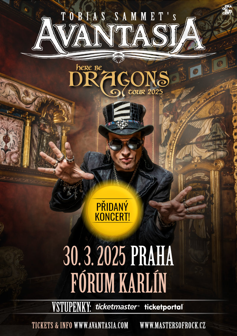 Slavná metalová opera Tobiase Sammeta, AVANTASIA vždy přivádí obecenstvo k úžasu, probouzí celou škálu emocí a mohutnou vlnu vzrušení! Už na konci února vdechne pan principál Toby život dalšímu, svému novému dílu, nazvanému „Here Be Dragons“ a vyrazí s ním na velkou pouť po Evropě! U nás, v PRAZE, ho ve zbrusu nové, velkolepé show, představuje 29. března! Každá show AVANTASIA je natolik chytlavá a působivá, že vás přímo vtáhne do děje a vy tento svět plný krásných melodií a energie nechcete opustit! Fanoušci milují tyto impozantní, barvité show a pražská zastávka turné „Here Be Dragons tour 2025“ se již téměř VYPRODALA!