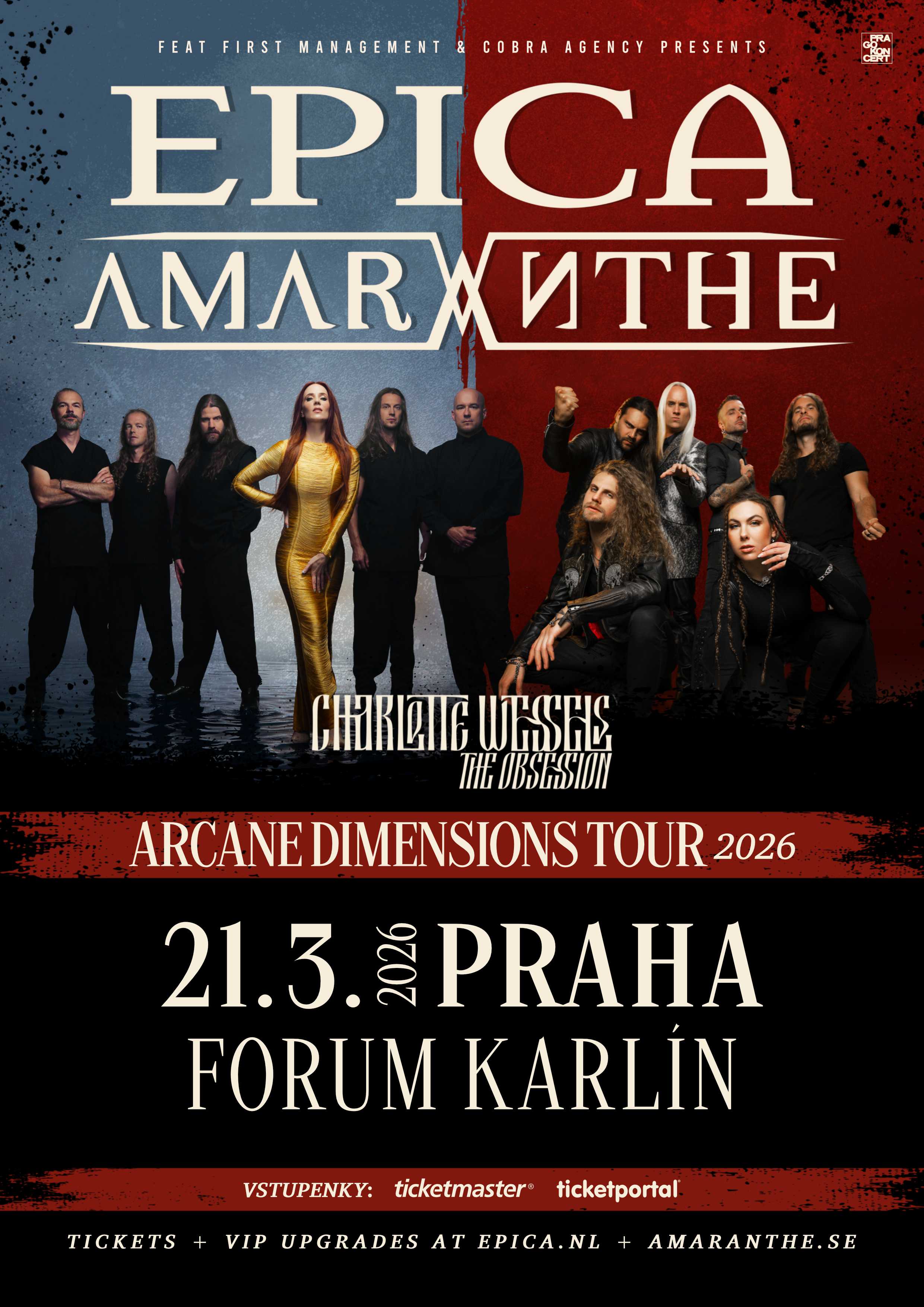 At the beginning of 2026, symphonic metal pioneers EPICA and metal giants AMARANTHE will join forces and embark on the “Arcane Dimensions Tour”, which will take them to 26 cities in 13 European countries! They will arrive in PRAGUE, Fórum Karlín, on Saturday, March 21st, 2026!