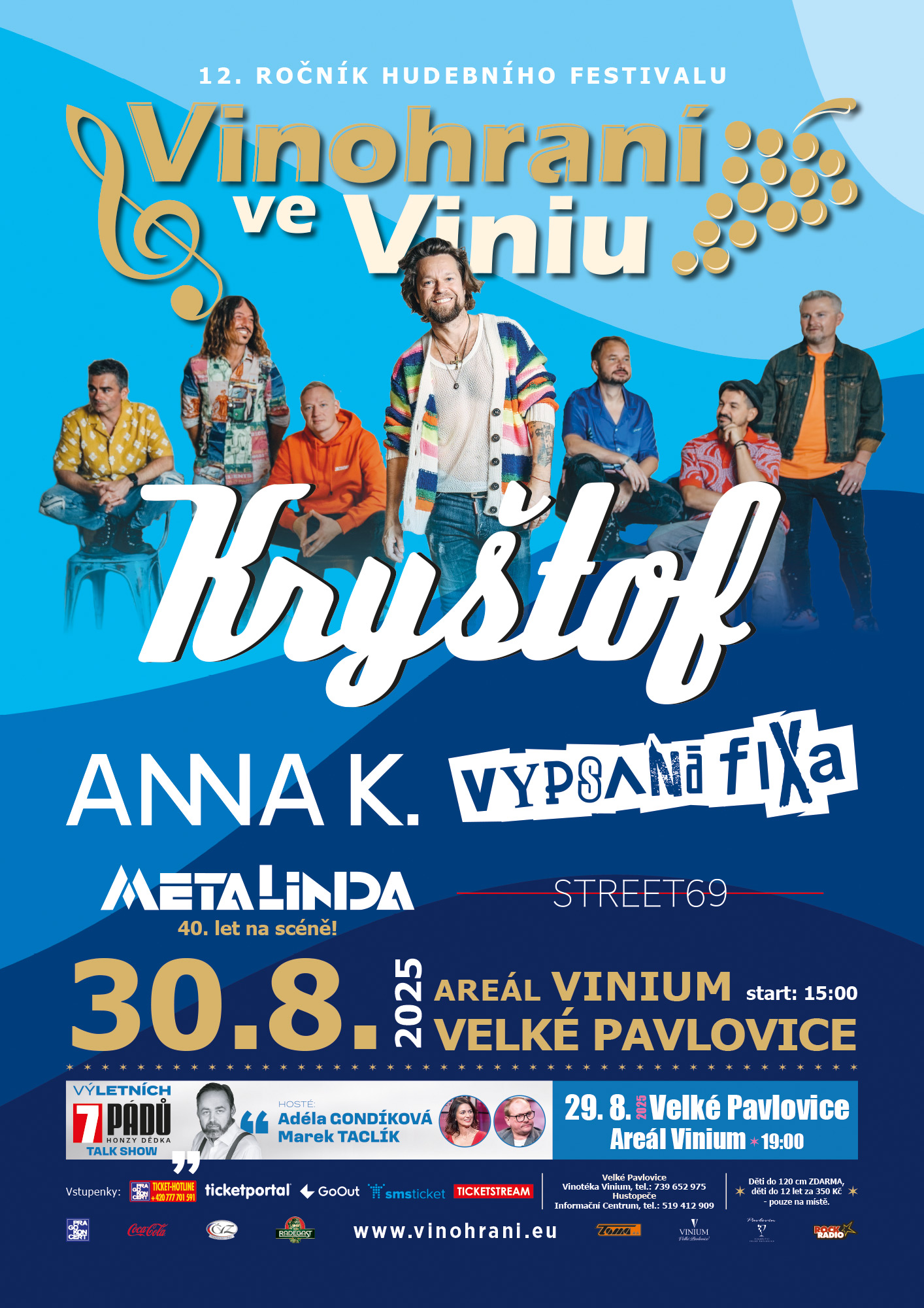 Jako každý rok, festival odstartuje už v pátek, 29. srpna. V areálu Vinium proběhne premiérově talk show "Výletních 7 pádů Honzy Dědka". Hvězdnými hosty budou oblíbení herci Adéla Gondíková a Marek Taclík. Vstupenky na tuto akci lze zakoupit zvlášť za předprodejní cenu 550 Kč.