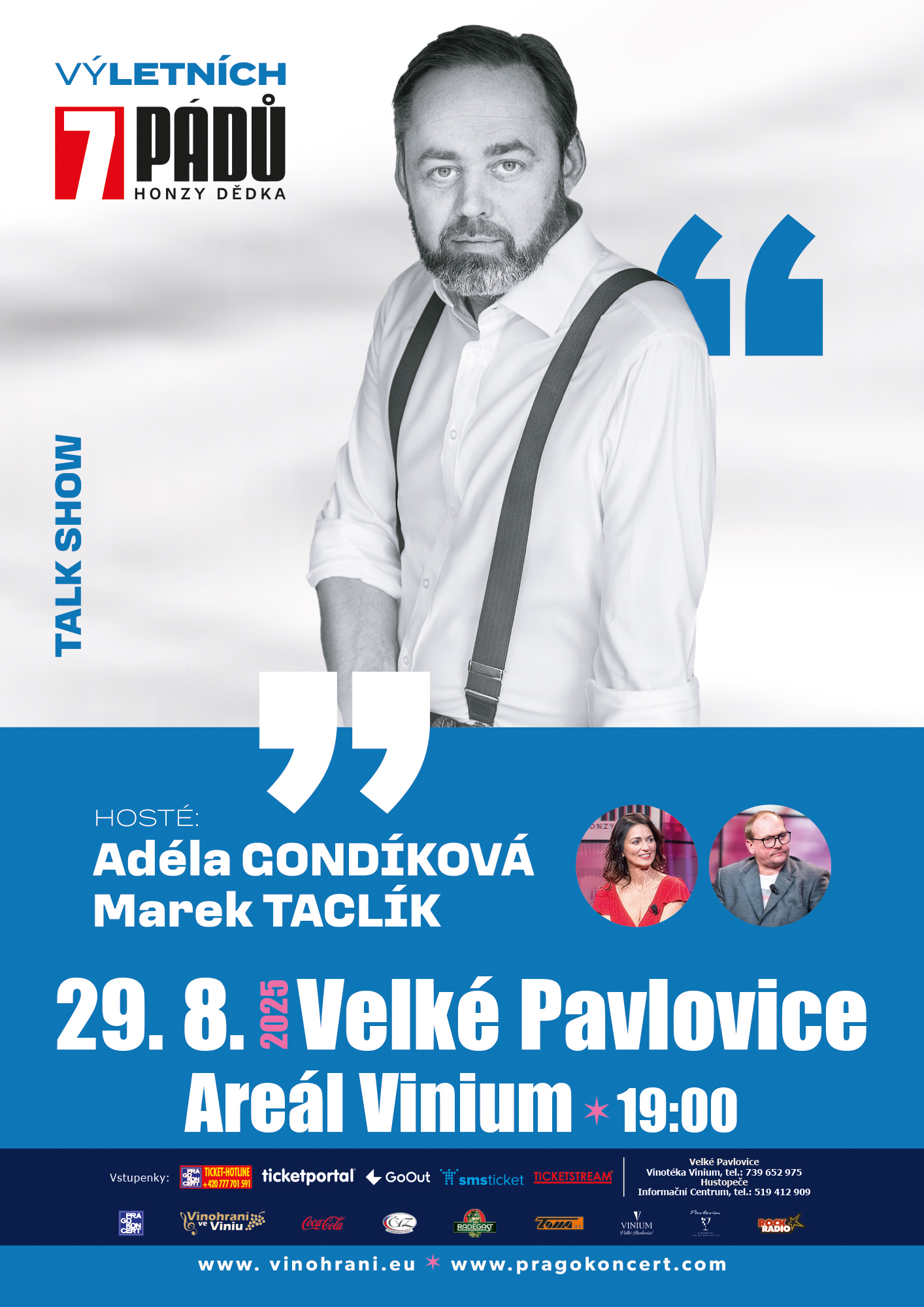 V rámci 12. ročníku hudebního festivalu Vinohraní zamíří zcela poprvé 7 pádů do Velkých Pavlovic, a to v pátek 29. srpna 2025. Těšit se můžete na oblíbené herce Adélu Gondíkovou a Marka Taclíka.