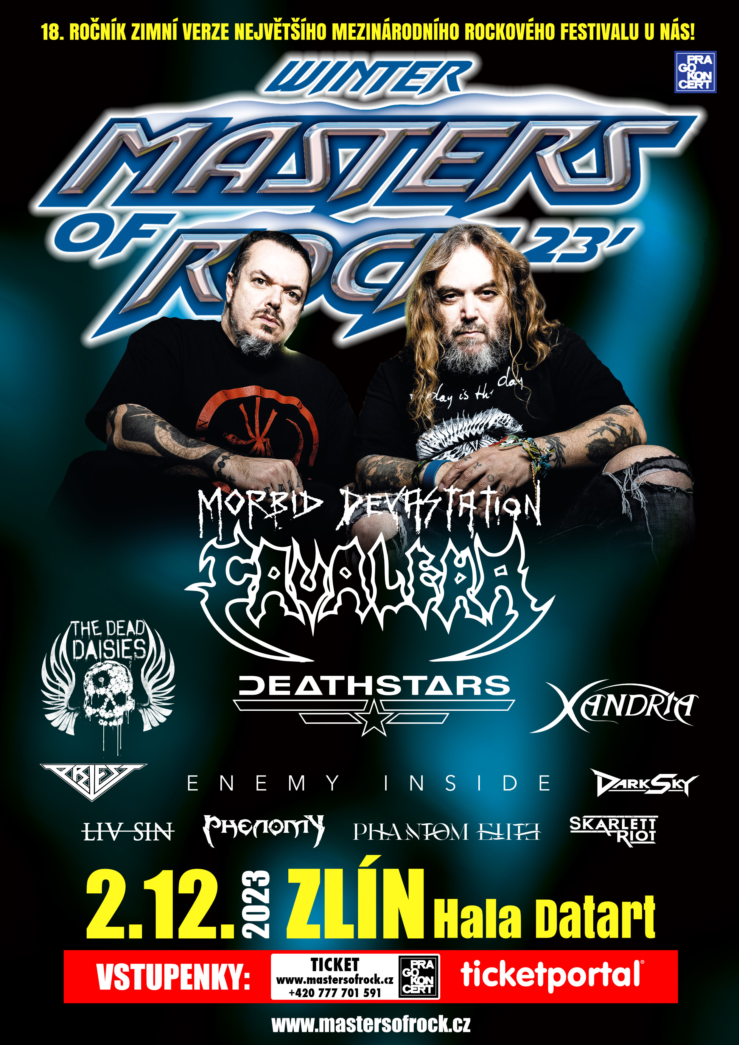 18. ročník mezinárodního rock-metalového festivalu ZIMNÍ MASTERS OF ROCK se uskuteční v sobotu 2. prosince 2023 ve ZLÍNĚ, v sportovní hale Datart a těšit se můžete na slavné bratry CAVALEROVI v unikátním projektu „Morbid Devastation“, all-star bandu THE DEAD DAISIES, industrial-death rockery DEATHSTARS, tajemnou sci-fi-gothic bandu PRIEST, belgickou blues-rockovou senzaci BLACK MIRRORS nebo zajímavou heavy-metalovou kapelu LIV SIN a řadu dalších kapel.