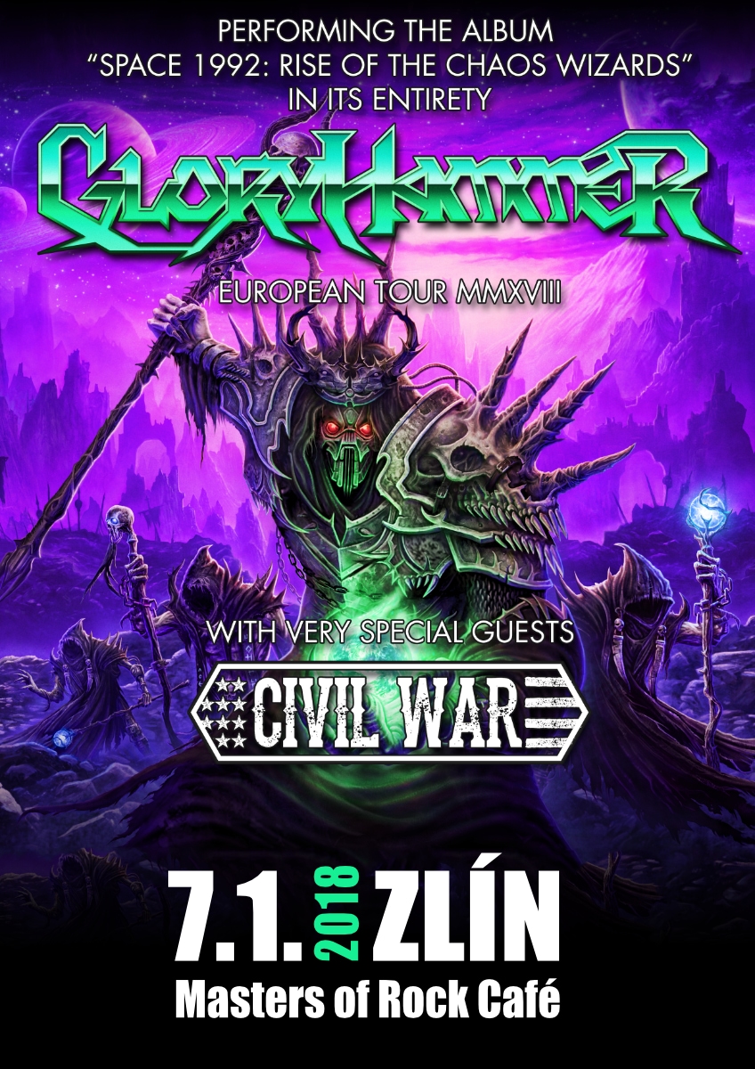 Skupina GLORYHAMMER má na kontě dvě hrdinská díla a to poslední s názvem »Space 1992: Rise of the ChaosWizards« chcou představit v rámci evropského headline turné. Jako podporu si s sebou vezou CIVIL WAR, kteří se ukáží s novým zpěvákem Kelly Sundown Carpentrem (exSABATON) a předvedou vám jak má vypadat správný švédský metal v podání nového studiového alba »The Last Full Measure«!